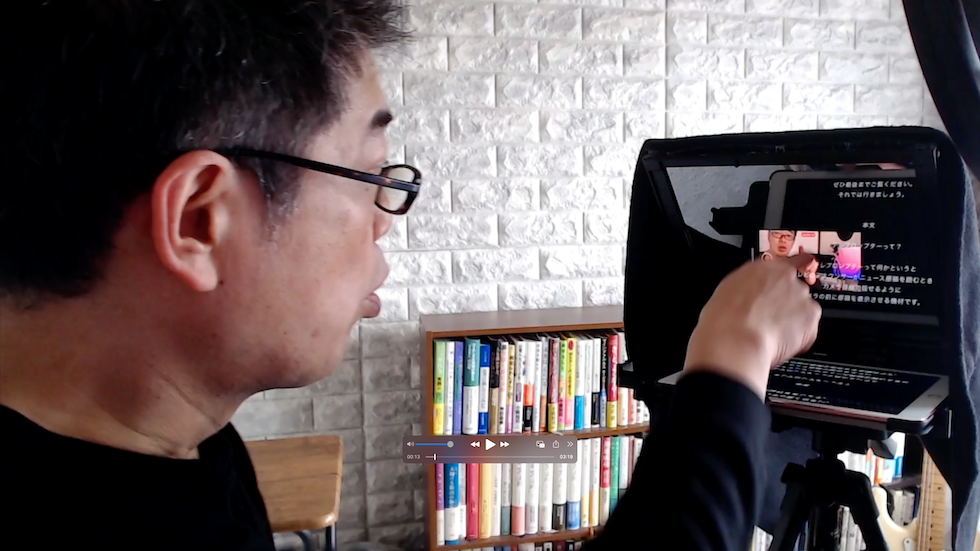 なぜテレプロンプターかというと台本なしで話すってやってみたんですけどできなかったんですね。それで台本見ながら話さないとできないって気づいて。それで台本見ながら撮影すると、カメラ目線でなかなか話せないんですね。