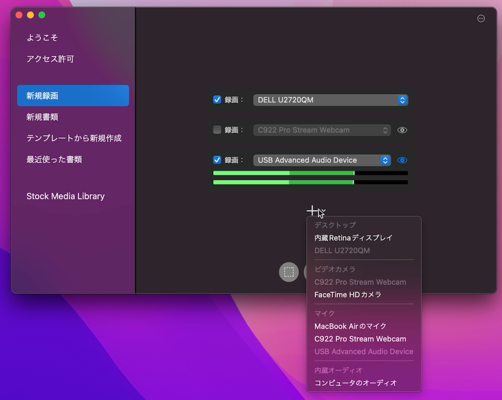 Mac内の映像を録画する設定です。Macだけを使用してる場合は一つしか選択項目が出ませんが、今回MacBook Airに外付けディスプレイに接続してますので、Macの画面か外付けディスプレイの画面かのどちらかを選択できます。項目を追加すると両方とも同時に録画することもできます。