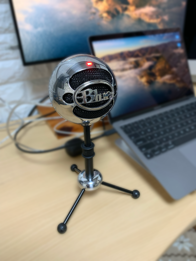 マイクは、Blue社のSnowBallというマイクを使ってます。ノイズが少なくて高音質で1万ちょっとと安価なのでオススメです。